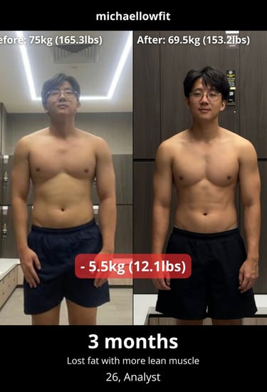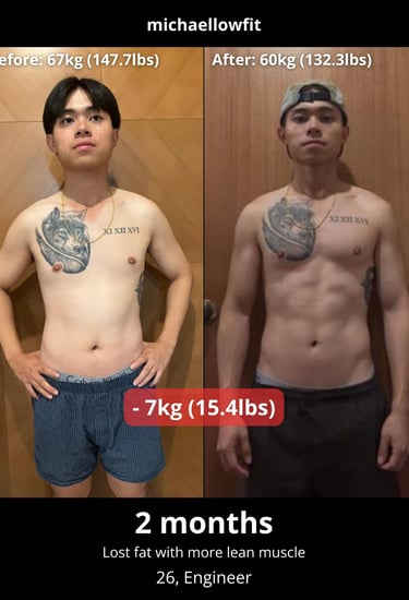 Through the coaching, he learnt how to actually lose fat in a sustainable way that he really enjoyed, with a manageable workout plan of 2 gym workouts & 1 run, he could commit to, while still eating out and going out for weekend dinners and drinks out.